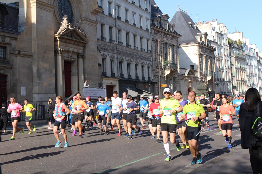 I am on the Pont Marie in a crowd of raucous spectators. It’s kilometre 15 of the 2017 Paris Marathon. I am the lone cheering section for my nephew, who is running his first marathon. As I try to spot him in the sea of bobbing heads, I remember his tip – red tee shirt and blue baseball cap – he said. Yeah, and the other 57,000 runners?